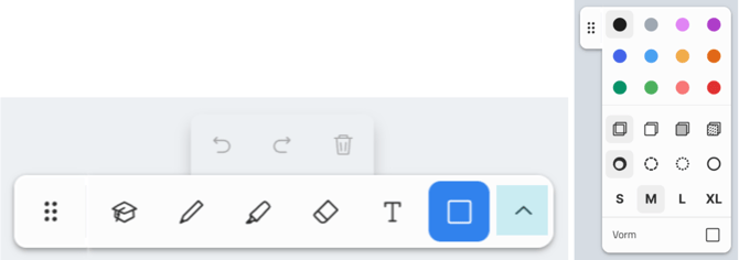 De pennentools bevatten ook een uitgebreide set aan standaardvormen die je kunt plaatsen in het platform, zoals vierkanten, cirkels, driehoeken, pijlen en meer. Je kunt alle vormen zien door op het pijltje te klikken dat helemaal rechts staat.