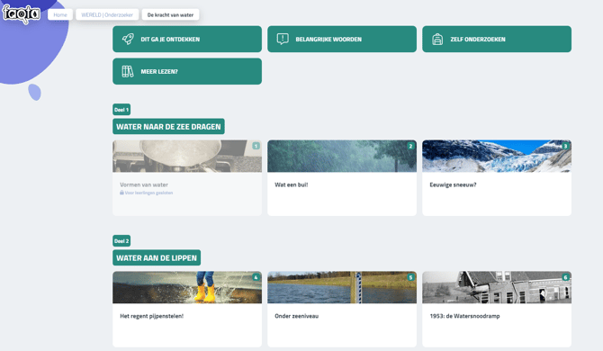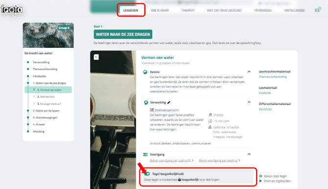 Wat zien mijn leerlingen als ik een tegel uitzet? Leerlingen zullen de uitgeschakelde tegel wel zien in hun lesoverzicht, maar ze kunnen er niet op klikken (zie voorbeeld in de onderstaande afbeelding is de tegel "Vormen van water" uitgezet). Alleen de tegels die zijn ingeschakeld, zijn toegankelijk.